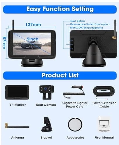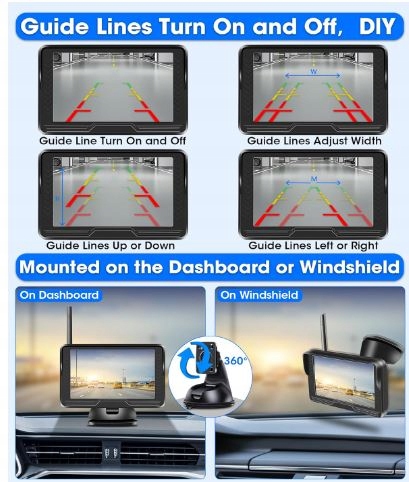 - Linia pomocnicza DIY, szeroki kąt widzenia 140° - bezprzewodowy monitor kamery cofania może ręcznie regulować szerokość linii prowadzącej i przesuwać ją w lewo/w prawo/w górę/w dół, aby zaprojektować linię prowadzącą, która pasuje do modelu samochodu. Dzięki szerokokątnej radiowej kamerze cofania 140° można zmniejszyć martwy kąt i zapewnić najbardziej odpowiedni widok z tyłu, naprawdę bezpieczne parkowanie. Monitor kamery cofania o przekątnej 5 cali jest wyposażony w uchwyt z przyssawką, można go dowolnie rozciągać, aby wydłużyć i obrócić klamrę, wybierz go na przedniej szybie lub desce rozdzielczej.