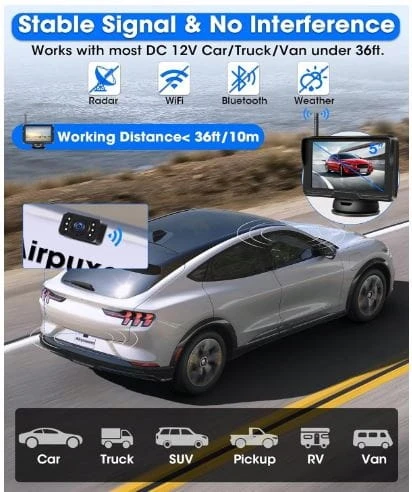 - Stabilna transmisja sygnału: Bezprzewodowy system kamery cofania ma wbudowany wydajny nadajnik bezprzewodowy, a monitor ma wbudowany odbiornik bezprzewodowy, transmisja obrazu jest bardziej stabilna, dzięki czemu można zobaczyć martwy kąt z tyłu bez zakłóceń i migotania. Odległość robocza kamery cofania może obsługiwać pojazdy do 10 m, które mogą być używane do samochodów typu van/pickup/SUV/samochodów itp.