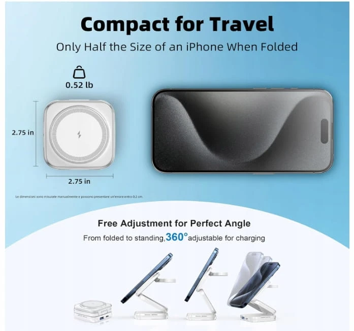 Najlepsze bezprzewodowe ładowanie w podróży: stacja ładująca W7 Flip ma ultrakompaktową, składaną konstrukcję, idealną do podróży, domu lub biura, która z łatwością mieści się w kieszeni lub torbie. Łączy w sobie lekkość i przenośność z wydajnością, ważąc zaledwie 0,52 funta.
