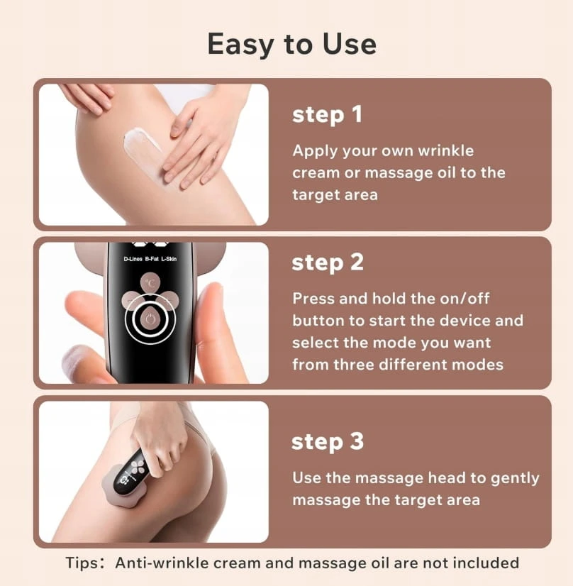 Nałóż olejek do masażu, wybierz jeden z 3 trybów, dostosuj intensywność i przesuwaj masażer w kółko nad obszarem docelowym. Automatyczne wyłączanie po 15 minutach. (Żel lub krem do masażu nie są dołączone)