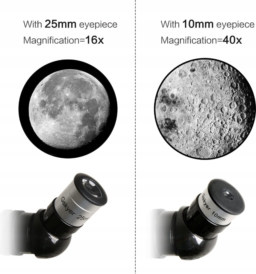 - W zestawie znajdują się dwa wymienne okulary oraz soczewka Barlowa 3x, co umożliwia trzykrotne zwiększenie mocy powiększenia.