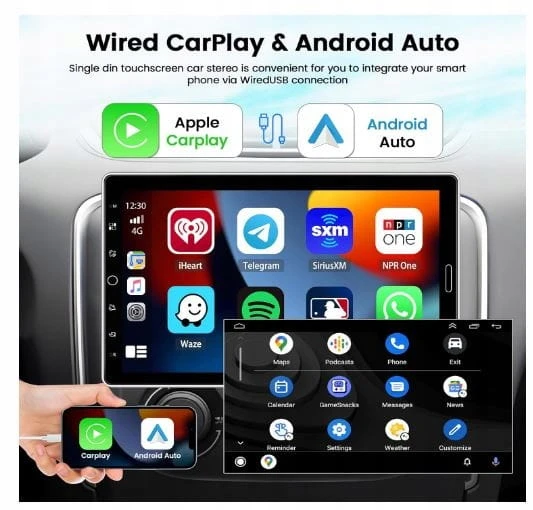 - Carplay/Android Auto/Mirror Link: radio samochodowe 1din obsługuje Carplay i Android Auto dla systemów Android do 12 i iOS do 15.6. Można go podłączyć do smartfona za pomocą oryginalnego kabla do transmisji danych, aby uzyskać dostęp do nawigacji na mapach, SMS, sterowania głosem i wielu innych. Funkcja Mirror Link synchronizuje zawartość telefonu z radiem, dzięki czemu można korzystać ze wszystkich aplikacji na swoim telefonie z szerszymi funkcjami