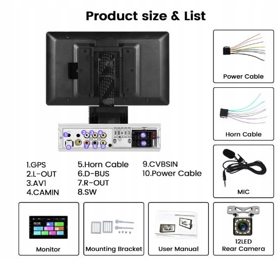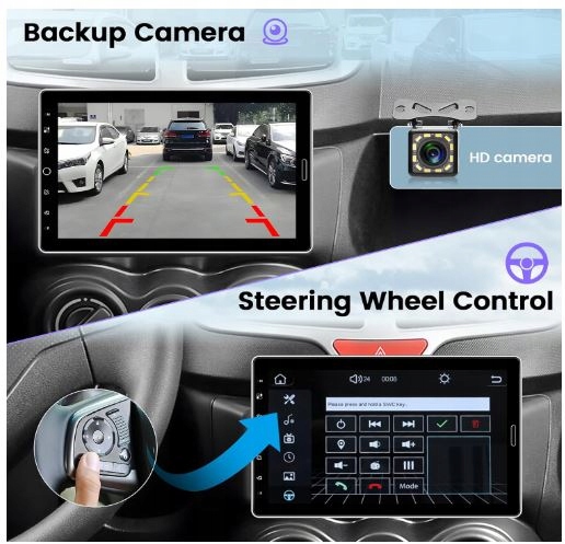 - Kamera cofania i SWC: radio samochodowe 1din jest wyposażone w wodoszczelną kamerę z noktowizorem na podczerwień i szerokim kątem widzenia 170°. Po włożeniu biegu wstecznego obraz cofania zostanie automatycznie wyświetlony na ekranie dotykowym radia samochodowego o przekątnej 10,1". Obsługa funkcji sterowania kierownicą, dzięki nauce przycisków kierownica może być używana do sterowania radiem samochodowym Bluetooth, co sprawia, że jazda jest wygodniejsza i bezpieczniejsza