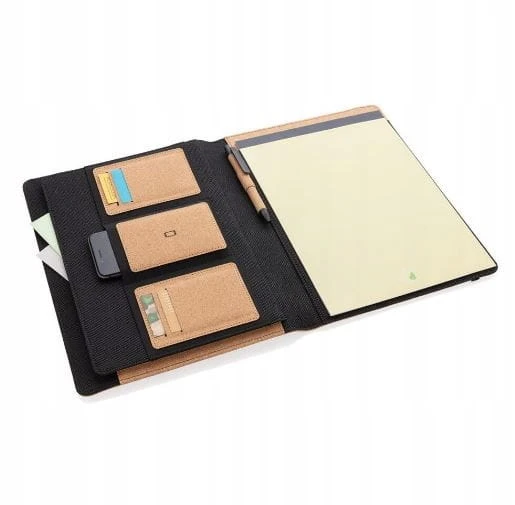 Korkowa teczka konferencyjna A4 z długopisem bambusowym, wewnątrz duża kieszeń i 2 mniejsze, kieszeń na telefon, 4 miejsca na karty kredytowe i 2 pętle na akcesoria do pisania, elastyczne zamknięcie w ozdobnym, kraftowym pudełku