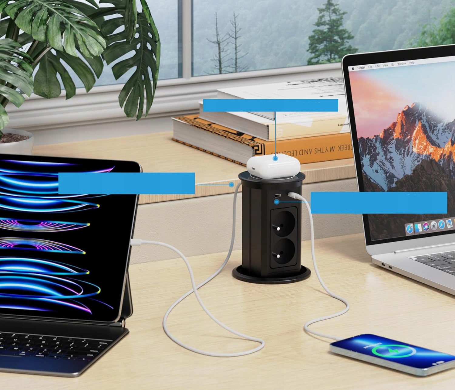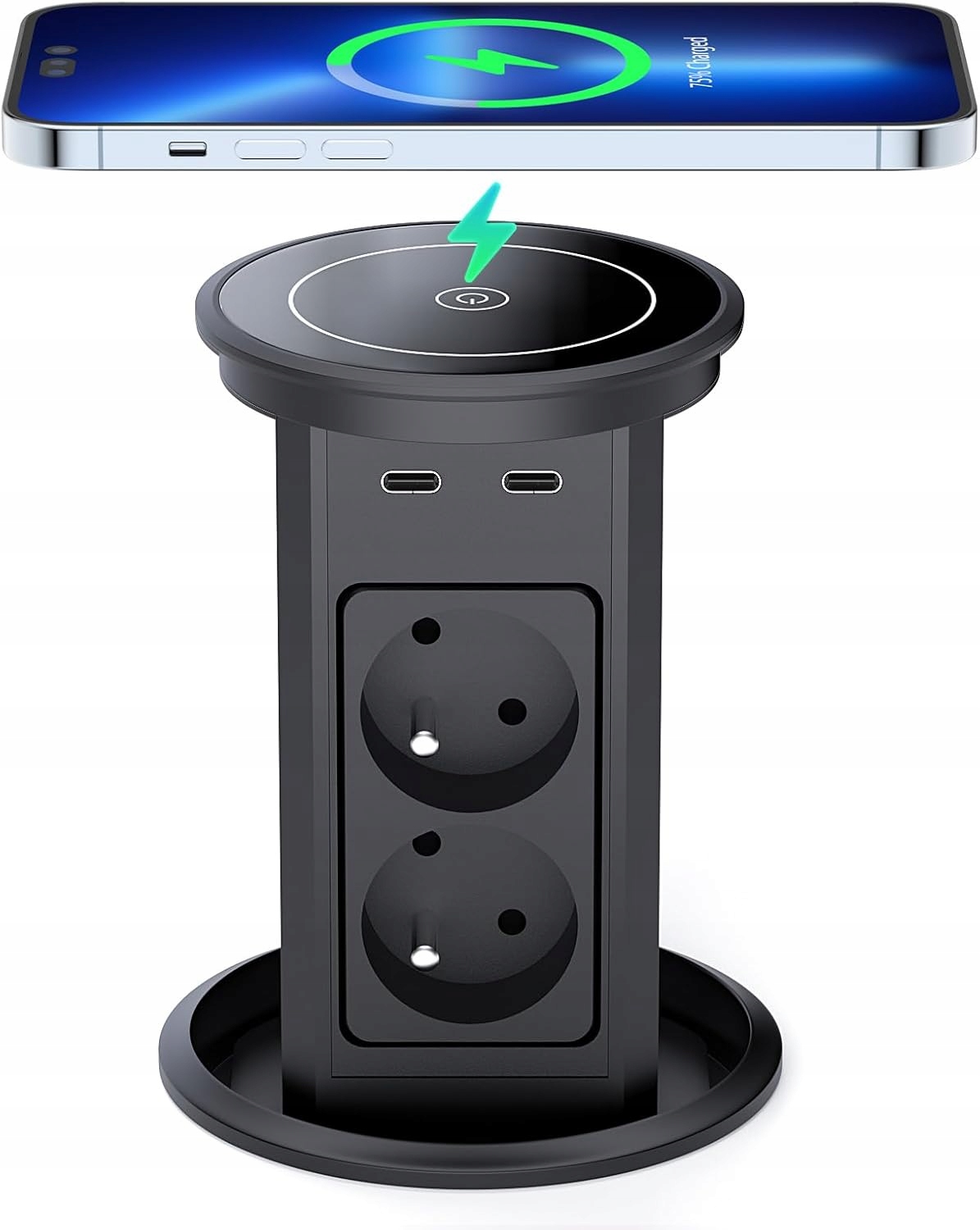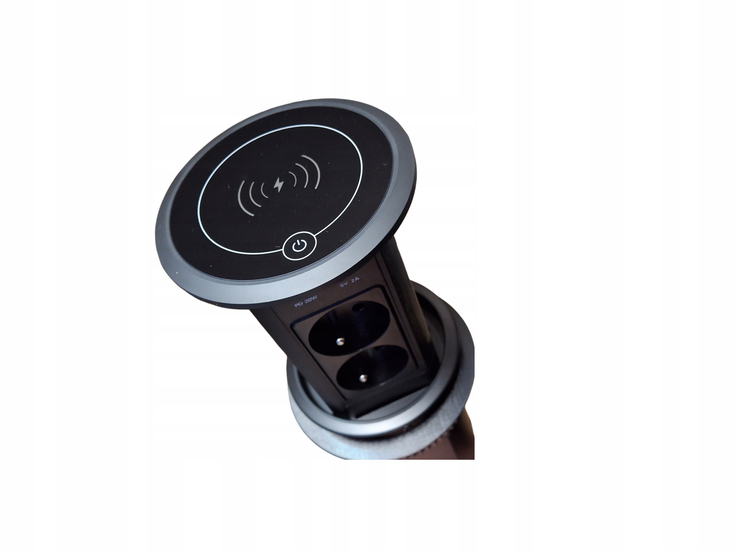 Gniazdo biurkowe 9 w 1, 1 ładowarka bezprzewodowa (kompatybilna ze wszystkimi urządzeniami zgodnymi ze standardem Qi), 4 gniazda sieciowe, 2 porty USB-C, 2 porty USB-A oraz kabel o długości 2 m. To wpuszczane gniazdo biurkowe oferuje więcej opcji ładowania, gdy potrzebujesz podłączyć wiele urządzeń jednocześnie.