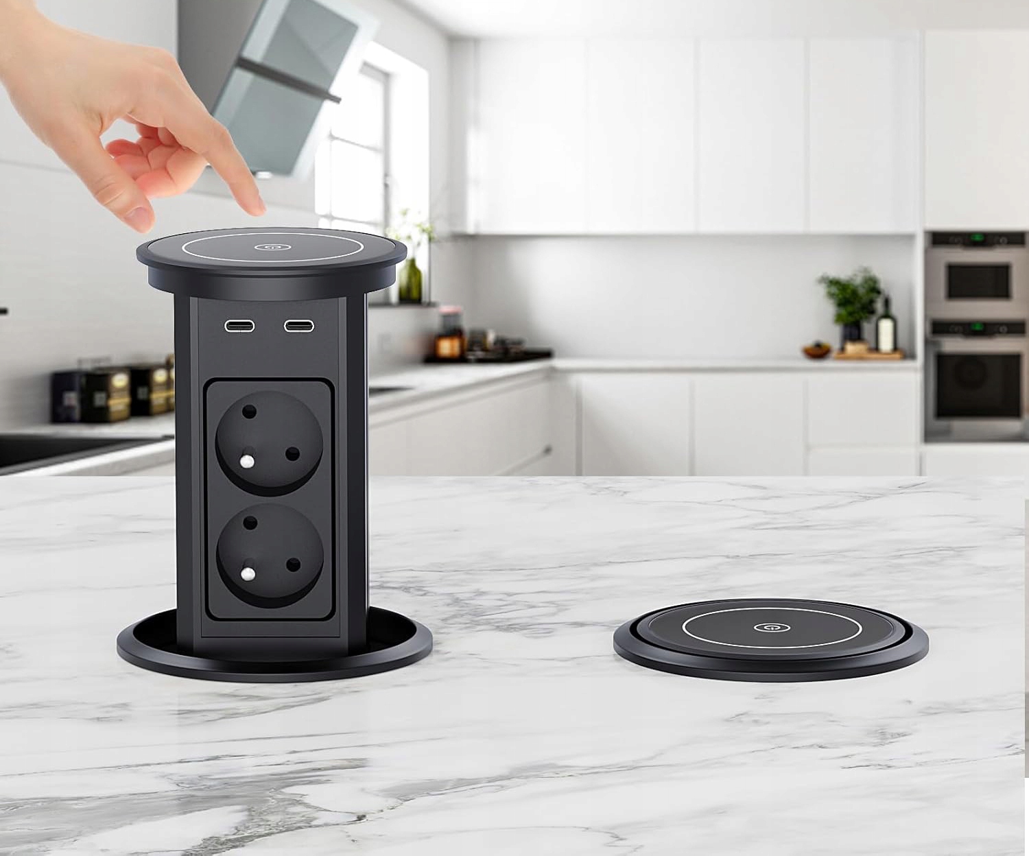 Łatwy montaż – Wystarczy wywiercić otwór o średnicy 100 mm w blacie stołu i umieścić w nim listwę zasilającą. Następnie przesunąć pierścień mocujący od dołu do góry, aż korpus będzie stabilnie przymocowany. Dzięki wysuwanemu designowi, gniazdo można schować pod biurkiem, gdy nie jest używane, co pomaga utrzymać porządek w miejscu pracy.