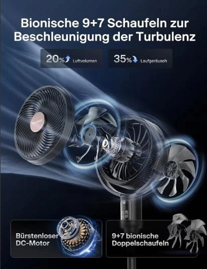 - Technologia Dual-Blade Hyperdrive: 18207 precyzyjnych cięć powietrza na sekundę* zapewnia zarówno wydajność, jak i komfort. System podwójnych skrzydeł przekształca siłę rotacyjną w 32% większy zasięg przepływu powietrza (w porównaniu do wentylatorów z jednym łopatką) i pracuje przy tym cicho (26 dB) – wystarczająco mocny, aby schłodzić z odległości 7,6 m, a mimo to wystarczająco cichy, aby używać w łóżku.