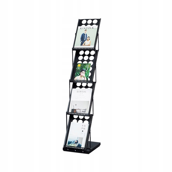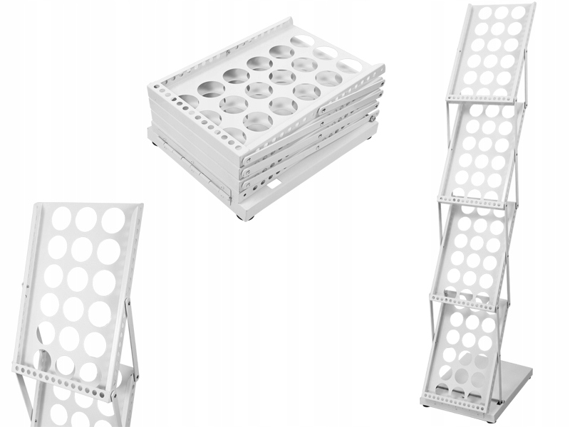 Wysokiej jakości składany stojak reklamowy na ulotki czy gazety formatu A4 (bądź mniejsze), wykonany ze stali, wolnostojący - nie wymaga przytwierdzenia do ściany lub podłogi.