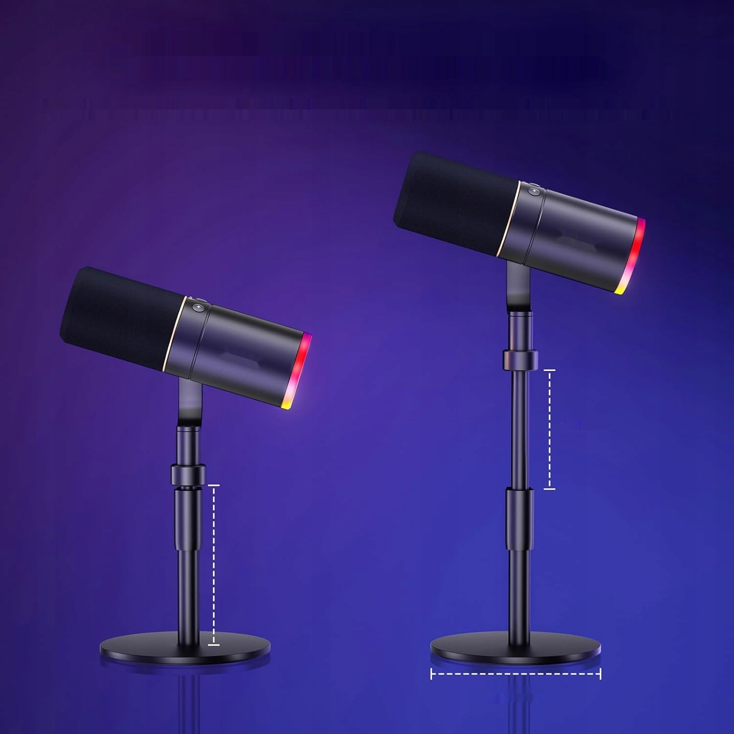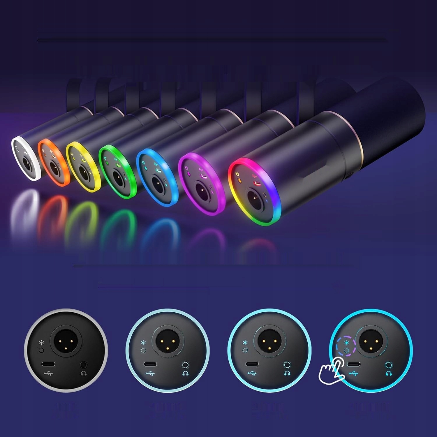 - Kolorowe podświetlenie RGB: Mikrofon wyposażony jest w pierścień RGB z 4 trybami i ponad 11 kombinacjami kolorów. Dzięki przyciskowi z tyłu mikrofonu możesz łatwo zmieniać kolory i dostosowywać jasność w czterech poziomach.
