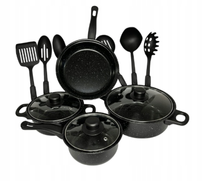Kompletny i praktyczny zestaw naczyń kuchennych w nowoczesnym, czarnym kolorze z delikatnym nakrapianiem. Idealny zarówno do codziennego gotowania, jak i jako wyposażenie nowej kuchni lub prezent.